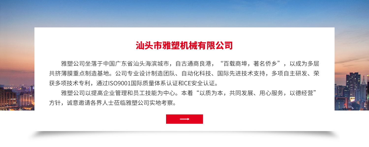 •   雅塑公司坐落于中國廣東省汕頭海濱城市,自古通商良港,“百載商埠,著名僑鄉”,以成為多層共擠薄膜重點制造基地。